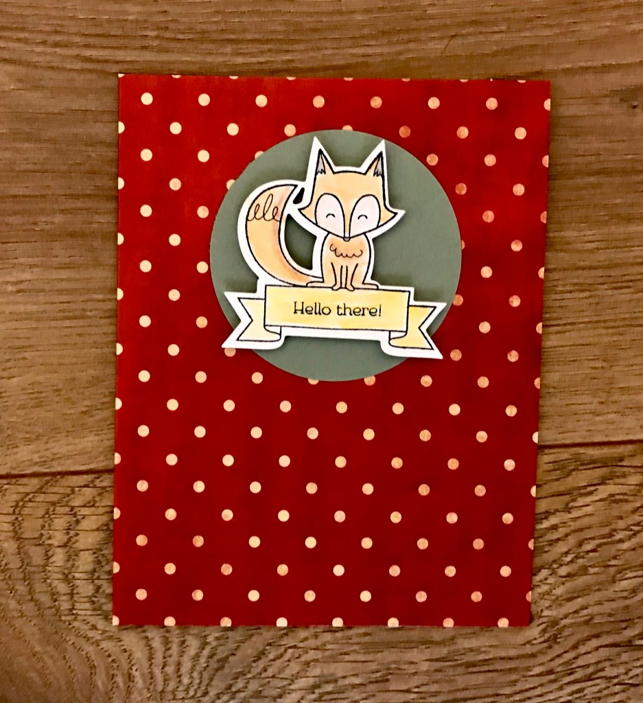 I punched a 2.25 inch circle out of olive green card stock from LCI Paper and glued it on to the card front. Used the fox stamp with the “hello there” sentiment and a bit of water color pencils to make the image pop a little. I mounted the image on foam squares to add a bit of depth.