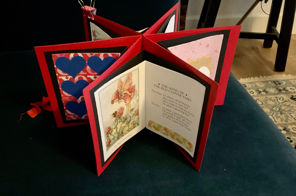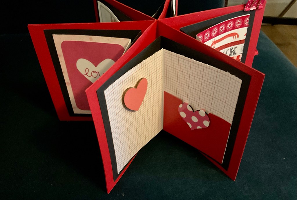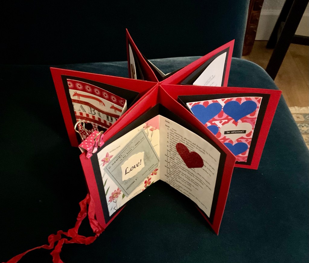 I really do spend way too much time watching crafting YouTube videos, and not enough time actually making crafty things. This weekend I decided to change the paradigm. Well, maybe not exactly. I saw an excellent video from Treasure Books on making a Christmas star card. It was beautiful! I thought I could use some of my junk journaling supplies and do a Valentine’s Day star card, so I did.