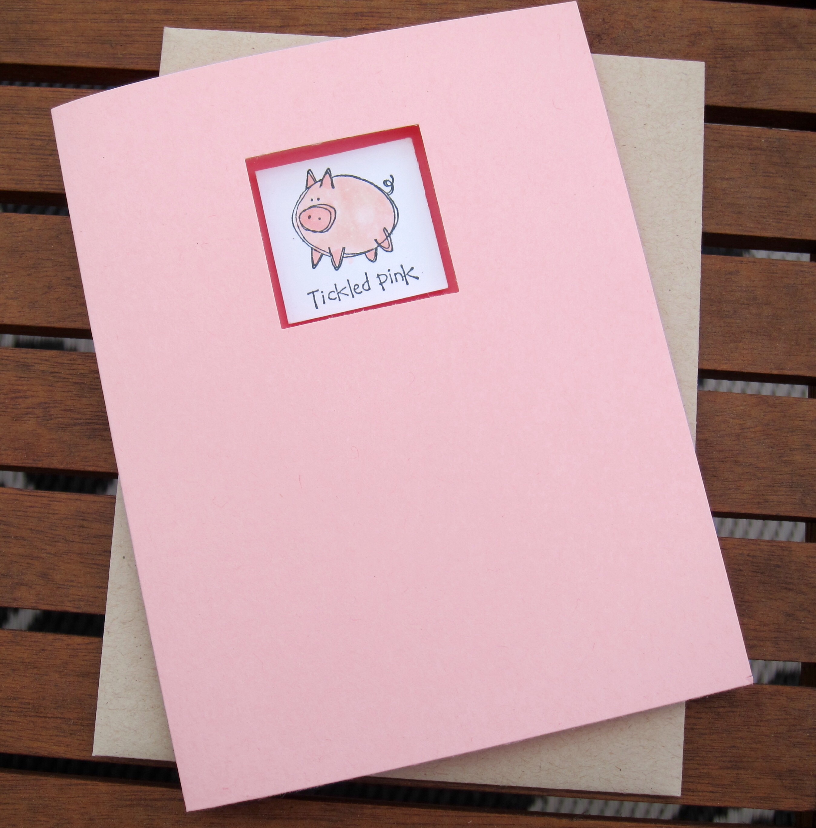 The stamp set Very Punny is fabulous and I had fun putting together this tickled pink card. I stamped the little pig on a white background, colored him with Copic markers, mounted him on a medium pink square and put it all together on a light pink card stock. Hope you like him!