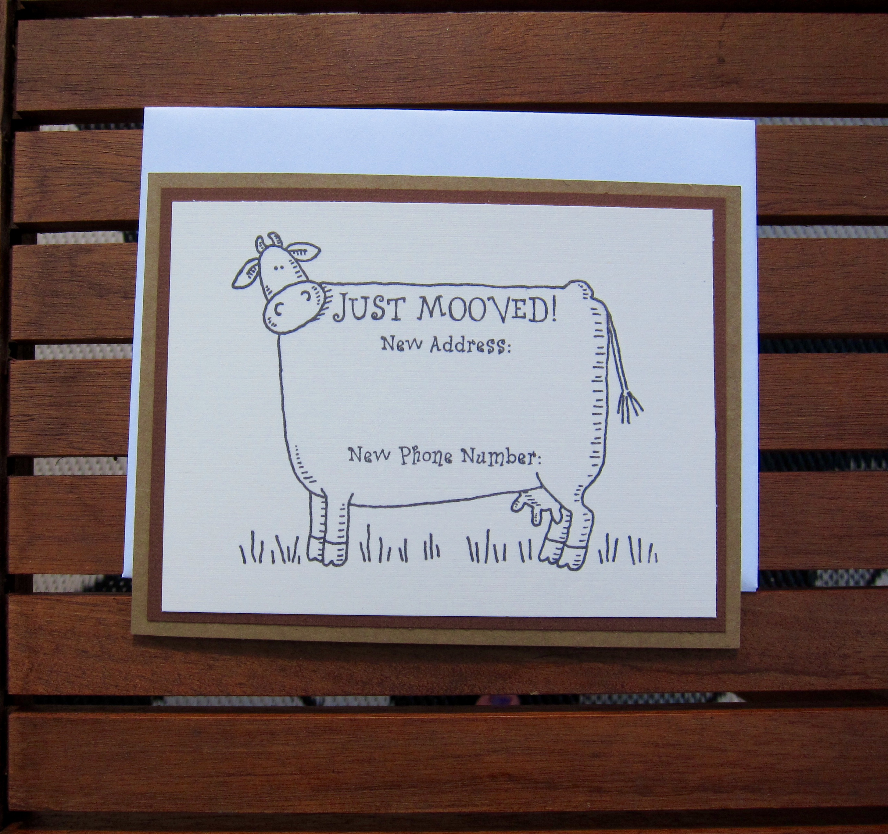 Now that I am back, I had to do something crafty. We have new neighbors, so i got a bunch of goodies at Trader Joe’s and made up a few change of address cards. I used a retired stamp from Stampin’ Up! Very cute!